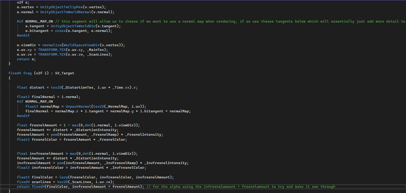 This is the code for the shader I created to give a holographic effect to an object, using a fresnel effect.