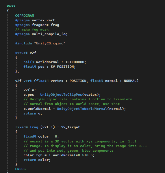 This is the code for the normal shader, a lot of the functionality is built into Unity already so it looks far less comlicated than the maths actually is
