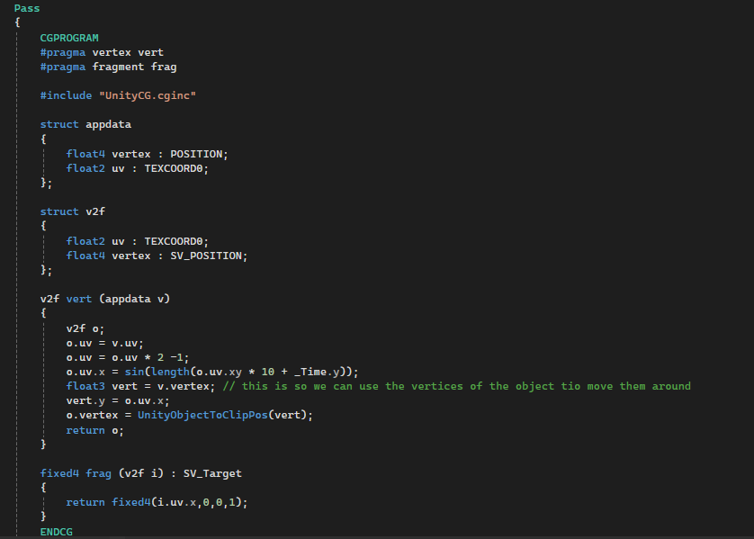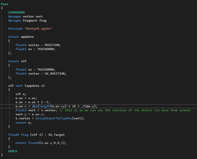 This is the code that moves the vertices in a ring effect by moving creating a sin wave that is animated along the length of the xy uv coordites multiplied by a magnification number, this magnification number will choose how large the rings are and then eventually they will start to intersect.