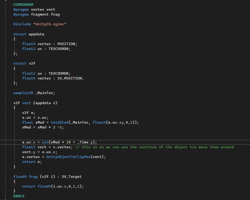 This is the code for the vertex displacement for all the verties, and it works by getting the coordinates of every vertice you want to move and moving them to the current position of another sin wave along the x axis.